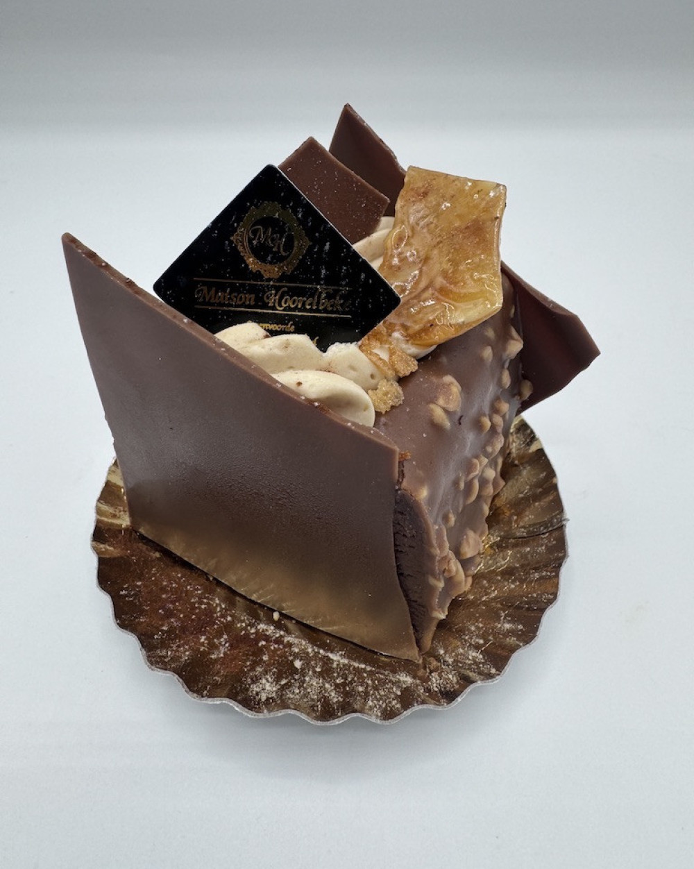 Biscuit moelleux chocolat, émulsion de mascarpone, brisures de nougatine, mousse chocolat, chantilly carambar et glaçage gourmand
