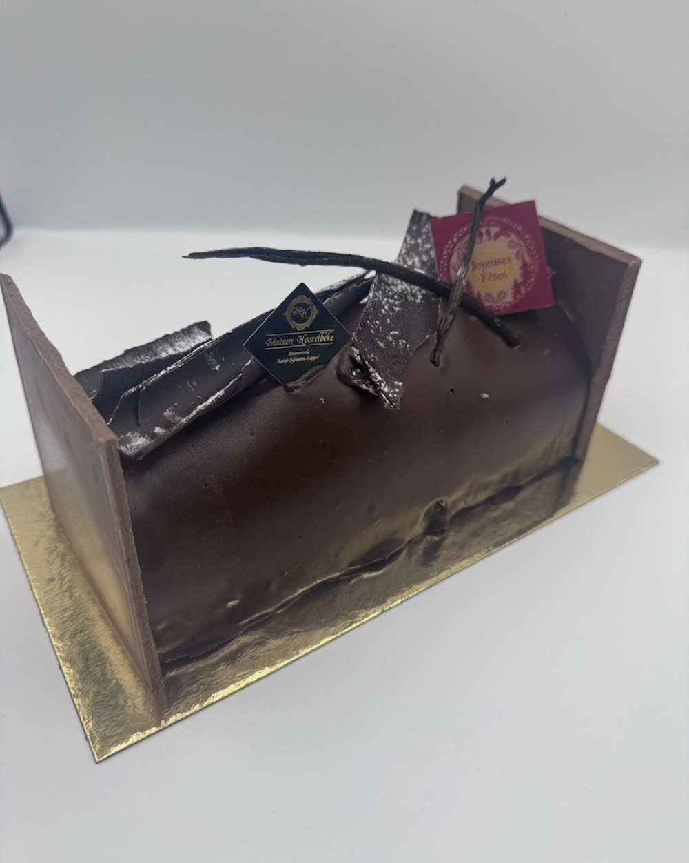 Biscuit chocolat , croustillant Duja, crémeux à la vanille grillée, ganache gianduja, mousse chocolat noir grands crus de Mamie à la cassonade